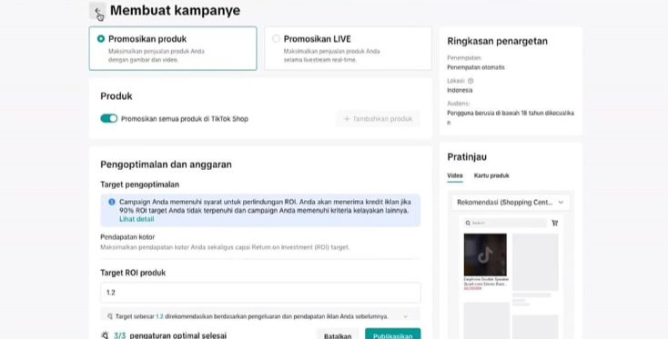 Terakhir, pastikan semua pengaturan sudah sesuai. Mulai dari nama campaign, produk, budget, hingga jadwal tayang. Jika semuanya sudah siap, klik tombol “Publikasikan” untuk menjalankan campaign. Campaign akan langsung berjalan sesuai jadwal dan Anda bisa memantau performanya di dashboard Ads Manager.