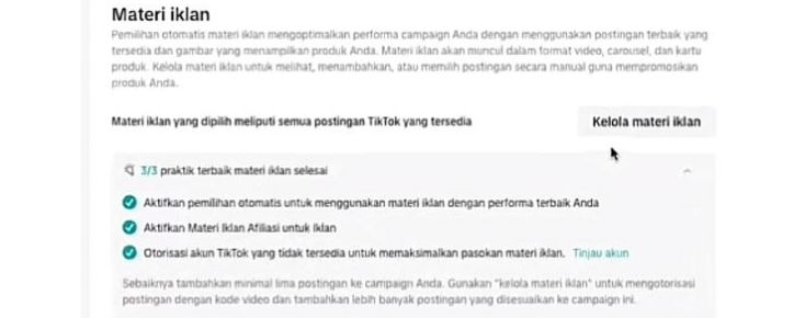 Pada tahap ini, sistem secara otomatis akan memilih materi iklan (ad creative) terbaik berdasarkan algoritma TikTok, biasanya berupa video organik dari KOL atau affiliator yang sudah menyematkan yellow cart pada produk Anda. Namun, jika ingin lebih spesifik, Anda tetap bisa memilih sendiri video mana yang akan digunakan sebagai bahan iklan.