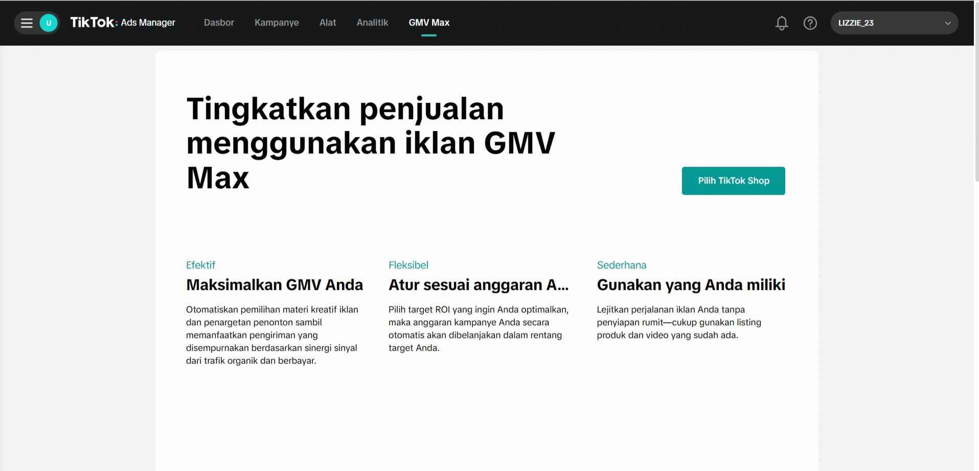 Setelah berhasil login ke dashboard Ads Manager, klik tab GMV Max di bagian atas menu utama dan “Pilih TikTok Shop”. Pastikan toko tersebut sudah terhubung ke Business Center, karena kalau belum, toko tidak akan muncul di daftar.