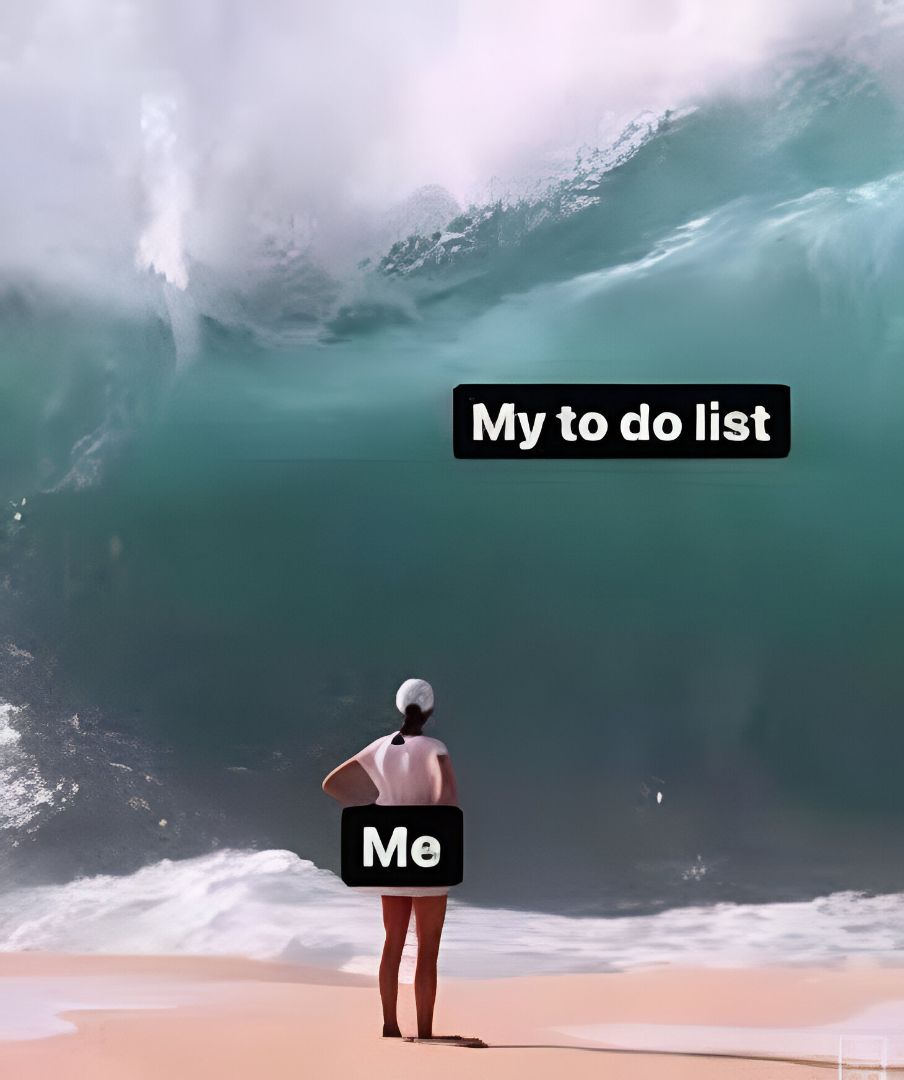 Dalam gambar ini, terlihat seseorang berdiri menghadap ombak raksasa yang diberi label "My To Do List", sementara dirinya sendiri hanya "Me". Meme ini menggambarkan beban kerja yang sangat besar dan kita siap menghadapinya.