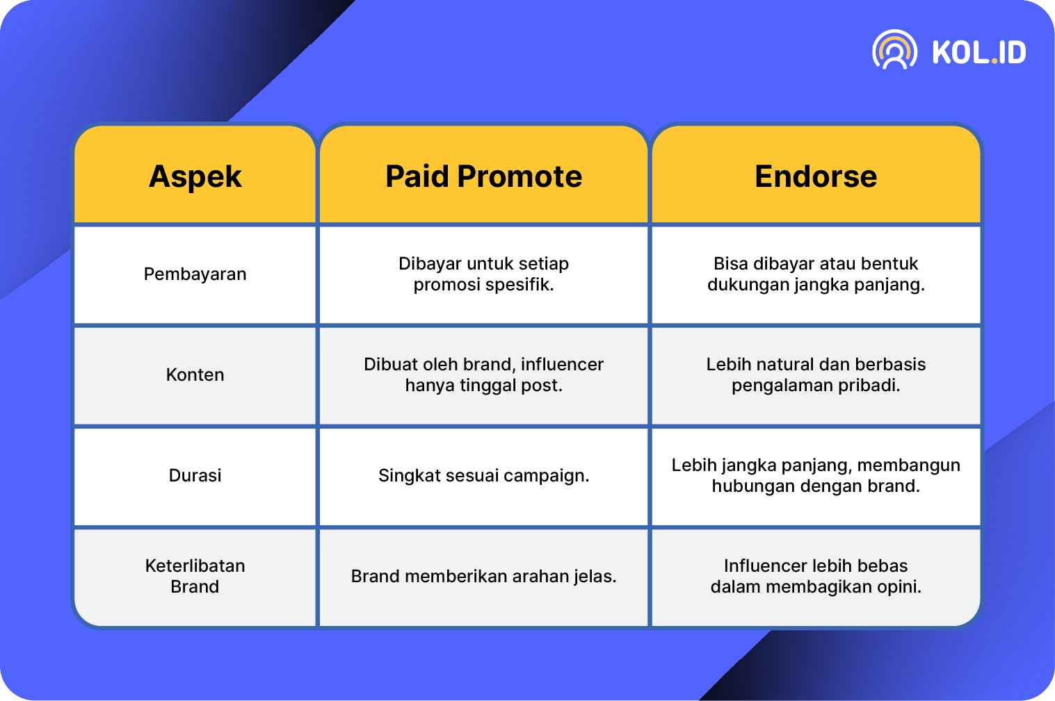 Untuk lebih mengetahui perbedaan antara Paid Promote dan Endorse, Anda bisa cek table di bawah ini!