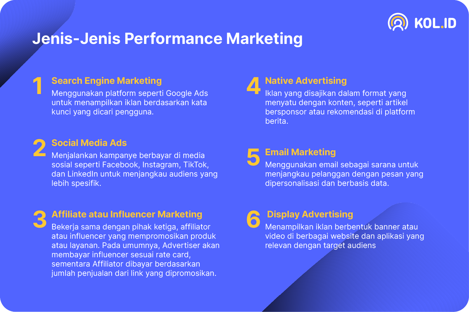 Pada praktiknya, metode marketing ini memiliki beberapa jenis media yang digunakan, berikut jenis-jenis performance marketing populer yang sering digunakan, antara lain: