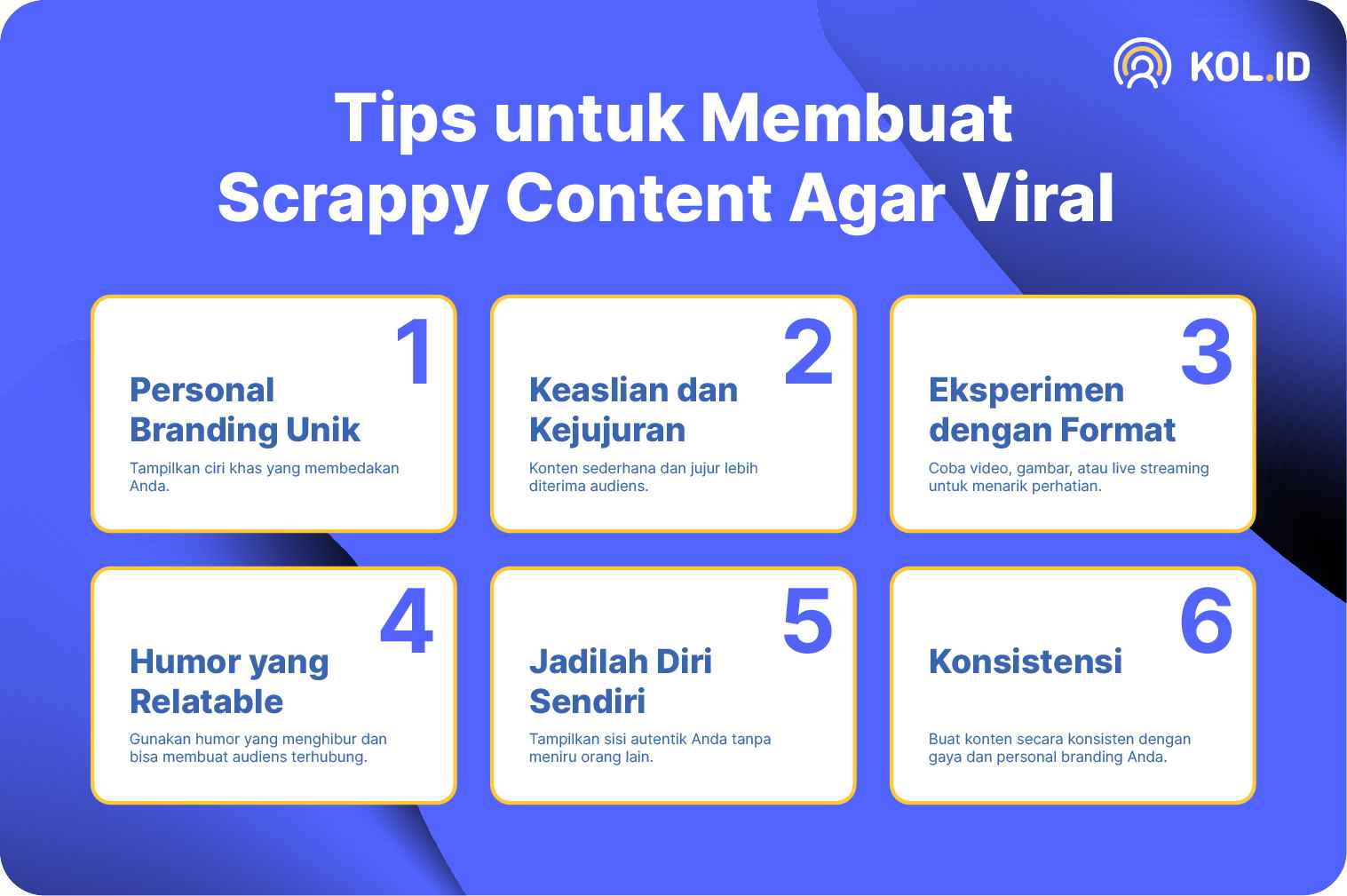 Bagi influencer atau KOL, scrappy content bisa menjadi cara yang efektif untuk membangun audiens dan keterlibatan. Meskipun terlihat mudah, nyatanya tidak semua konten yang dibuat “asal” bisa viral. Nah, terdapat beberapa tips untuk membuat scrappy content agar viral, yaitu: