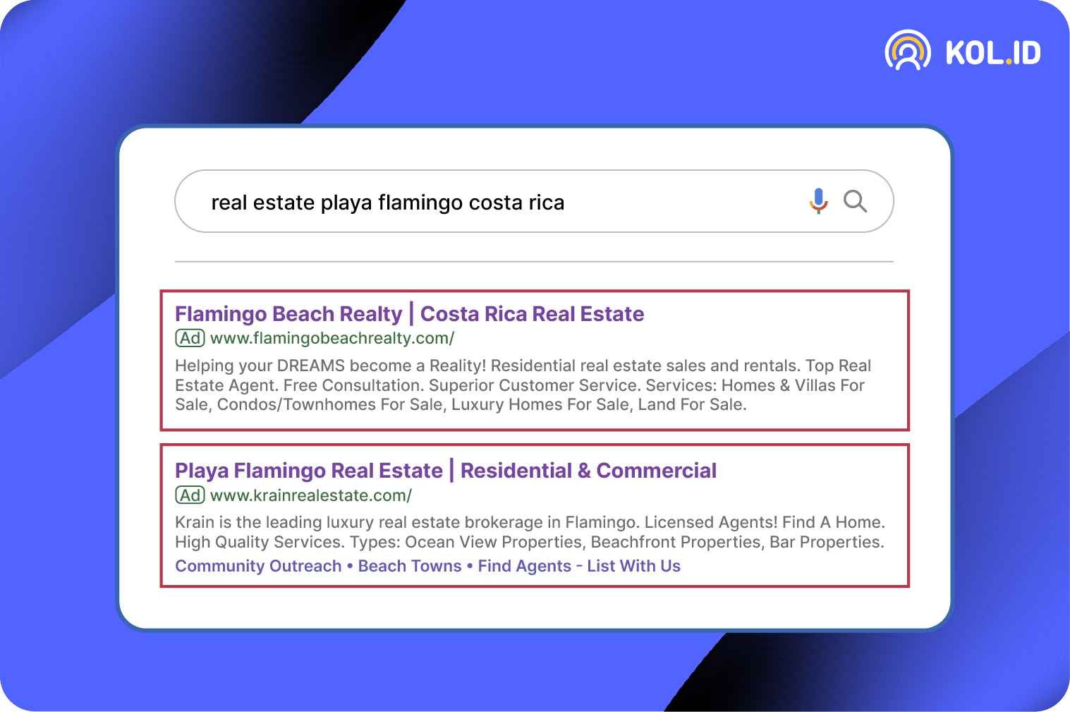 Iklan ini muncul di bagian atas hasil pencarian saat pengguna mengetikkan kata kunci tertentu. SEA kerap digunakan untuk meningkatkan visibilitas dan mendatangkan traffic dalam waktu singkat.