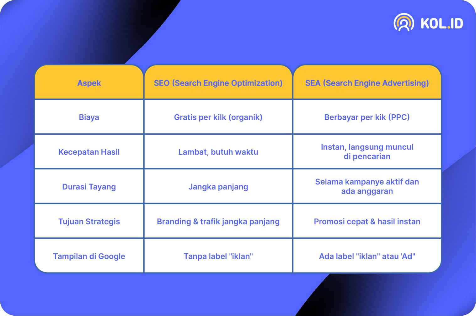 Tapi, bagaimana sebenarnya cara kerja SEA marketing? Apa keuntungannya dibanding strategi lain? Dan apakah cocok untuk bisnis Anda? Yuk, temukan jawabannya hanya di KOL.ID!