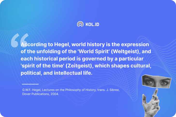 Dengan kata lain, Hegel percaya bahwa setiap zaman memiliki “jiwa” atau semangat kolektif yang membentuk cara berpikir, bertindak, dan menciptakan berbagai karya budaya. Zeitgeist inilah yang membuat suatu era berbeda dari era lainnya, karena ia menyatukan berbagai bidang kehidupan dalam satu corak yang khas.