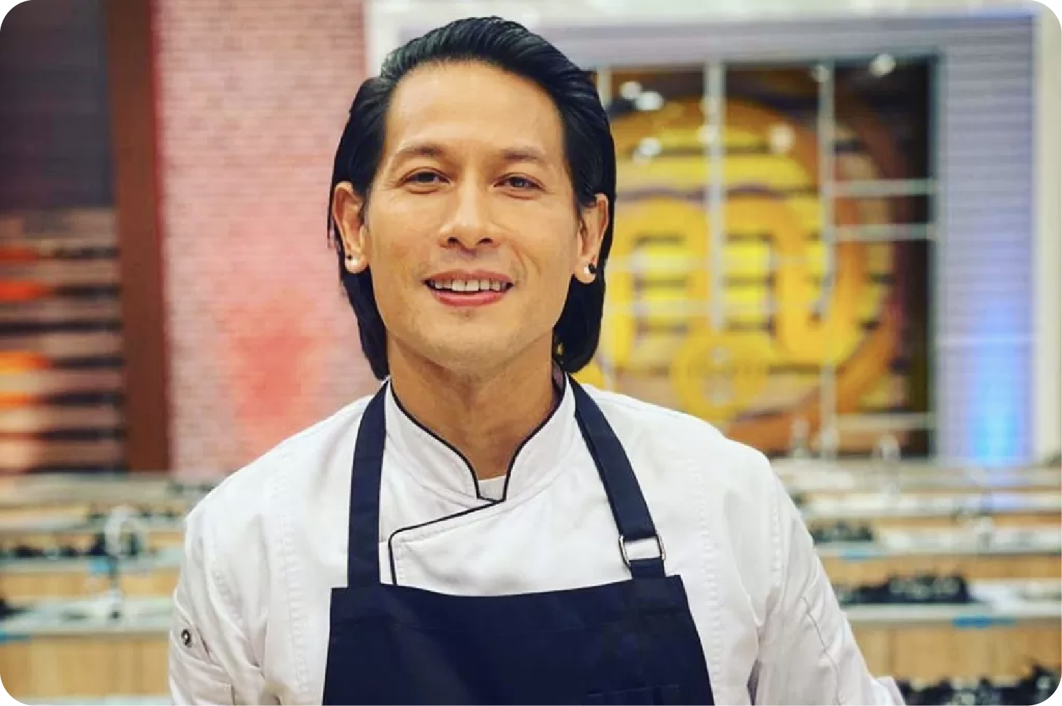 Chef Juna dikenal dengan standarnya yang tinggi dalam memasak dan detail-oriented. Kepribadiannya yang tegas dan berwibawa membuatnya menjadi figur mentor yang disegani sekaligus inspiratif di dunia kuliner. Berkolaborasi dengan Chef Juna dapat memberikan kesan eksklusivitas dan kualitas tinggi pada produk Anda.