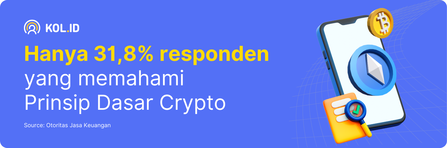 Meskipun peminat investasi crypto tinggi, tingkat literasi crypto di Indonesia masih sangat rendah. Data dari OJK mencatat hanya 31,8% responden yang memahami prinsip dasar crypto. Angkanya semakin mengecil ketika pertanyaannya ditingkatkan ke hal-hal yang bersifat advance.