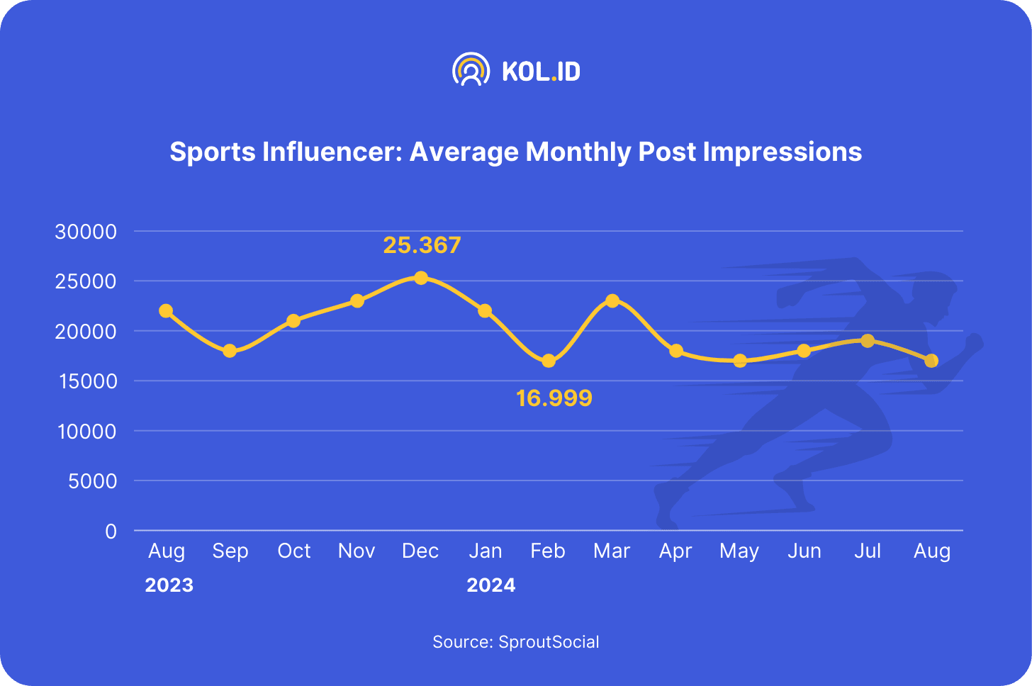 Grafik diatas menunjukkan bahwa jumlah rata-rata impresi atau jangkauan unggahan influencer olahraga mengalami naik turun sepanjang periode 2024. Puncak tertinggi tercatat pada Desember 2023 sekitar 25.367 ribu kali dilihat pengguna. Jangkauan terendah pada Februari 2024 dilihat oleh sekitar 16.999 ribu pengguna. Meskipun ada penurunan selama tahun 2023-2024, jangkauan unggahan influencer mengenai olahraga tetap berada di angka yang cukup tinggi dan tidak pernah turun drastis di bawah 16 ribu.
