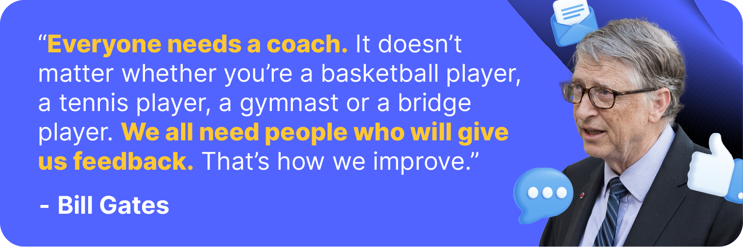 Pada sebuah TED Talk di US pada tahun 2013, Bill Gates menyampaikan bahwa “Semua orang membutuhkan mentor. Baik Anda seorang pemain basket, pemain tenis, senam, atau bridge player. Kita semua membutuhkan seseorang yang memberikan kita masukan. Itulah cara kita berkembang.”