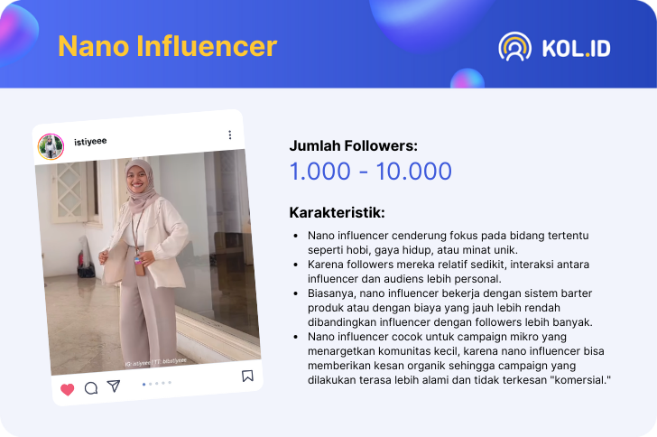 Nano influencer adalah kelompok dengan jumlah followers yang relatif kecil, tetapi biasanya sangat terlibat (engaged). Mereka sering kali memiliki audiens yang terdiri dari teman, keluarga, atau komunitas lokal yang mereka kenal dengan baik. Hal ini membuat nano influencer sangat dipercaya dan memiliki tingkat interaksi yang tinggi.