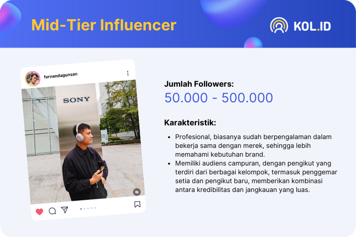 Mid-tier influencer berada di antara micro dan macro. Kelompok ini memiliki jangkauan yang lebih luas tetapi tetap relevan dan relatable untuk audiens mereka. Mid-tier influencer sering kali dianggap sebagai "sweet spot" dalam banyak strategi pemasaran.