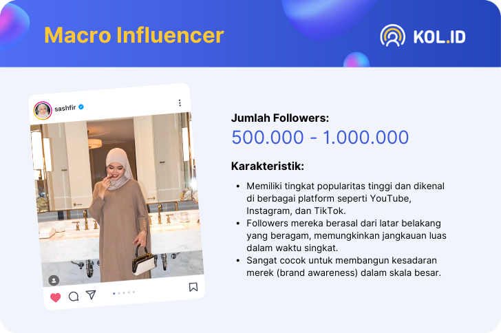 Macro influencer adalah mereka yang memiliki followers besar dan sering kali dikenal di luar platform media sosial. Mereka mungkin seorang selebritas online atau figur publik yang memiliki audiens luas.