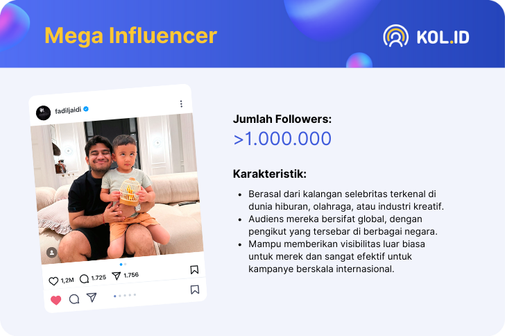 Mega influencer adalah kelas atas dalam dunia influencer. Mereka adalah selebritas besar, tokoh masyarakat, atau influencer terkenal dengan jumlah followers yang sangat besar. Dalam banyak kasus, mega influencer lebih fokus pada branding daripada interaksi personal dengan audiens mereka.