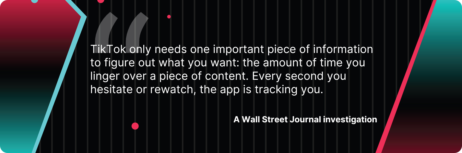 Hasil investigasi dari Wall Street Journal mengungkapkan bahwa TikTok hanya memerlukan satu informasi penting untuk memahami preferensi Anda, yaitu durasi waktu yang Anda habiskan pada setiap konten. Setiap durasi yang dihabiskan untuk berhenti atau menonton ulang, TikTok bisa melacak dengan algoritmanya.
