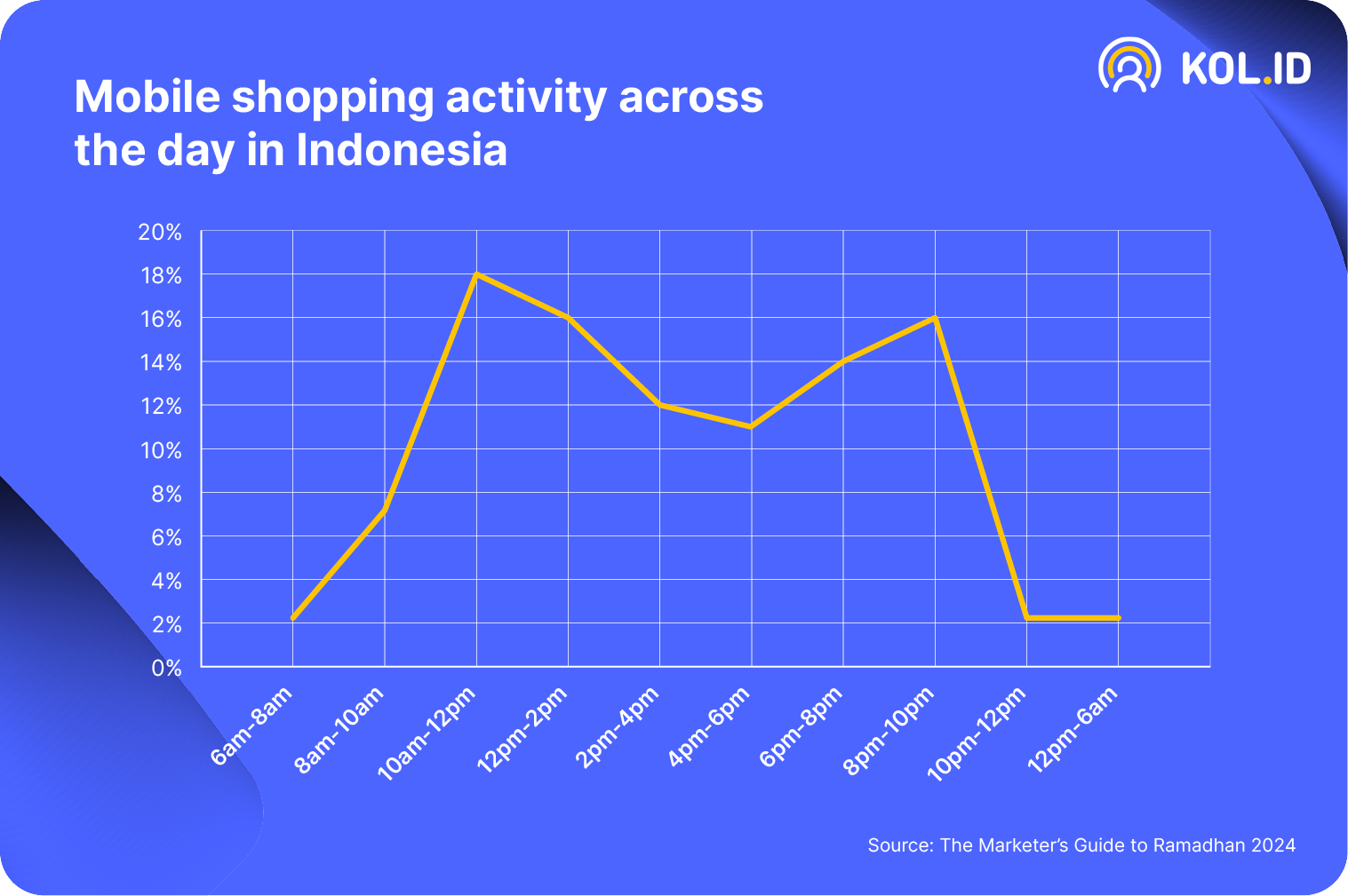 Ini menunjukkan bahwasannya waktu siang hari menjadi momen penting bagi konsumen untuk mencari dan membeli produk. Lalu, konsumen aktif belanja online lagi setelah selesai berbuka puasa dan beribadah. Berikut KOL.ID merangkum waktu terbaik konsumen belanja online: