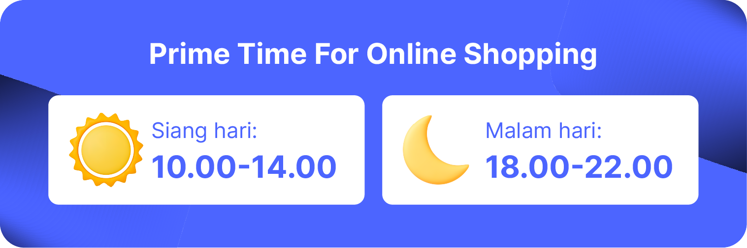 Perilaku konsumen saat ramadhan yang harus diketahui para pelaku bisnis selanjutnya yaitu waktu terbaik untuk belanja online. Konsumen Indonesia cenderung aktif berbelanja online sepanjang hari. Namun ada 2 waktu utama atau “prime time” di mana aktivitas belanja mencapai puncaknya yaitu menjelang siang dan malam hari setelah berbuka puasa.