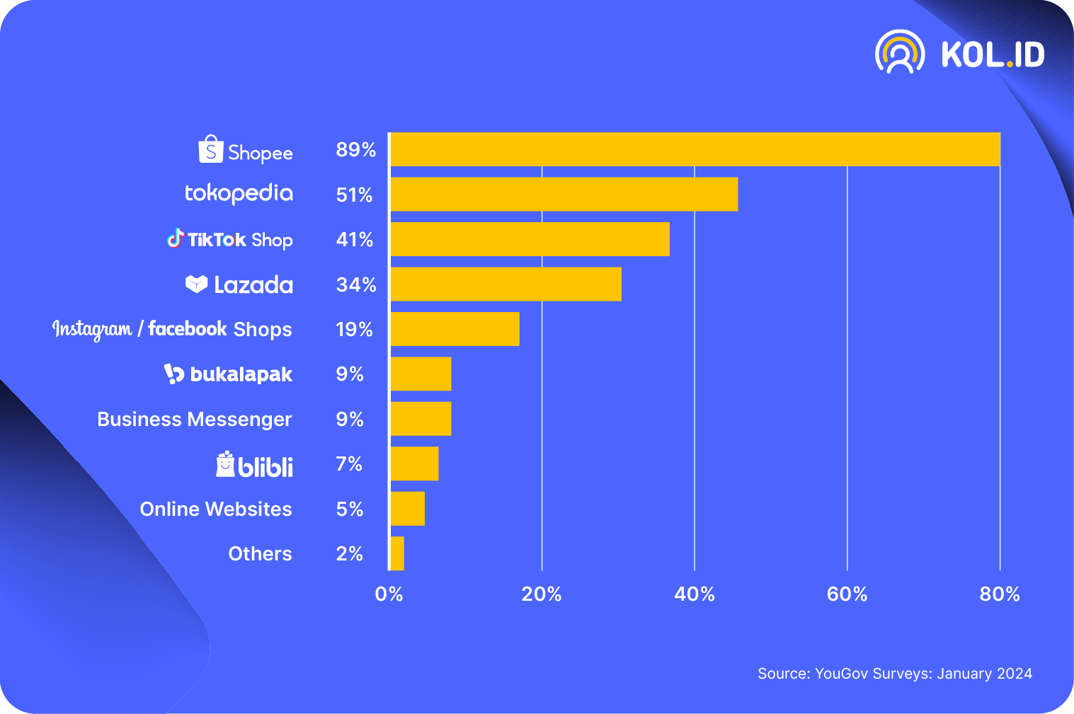 Setelah mengetahui prime time konsumen belanja online saat ramadhan, lantas muncul pertanyaan, E-commerce mana ya yang paling populer di kalangan konsumen saat ramadhan? Nah, Berdasarkan data dari YouGov, Shopee menduduki peringkat pertama sebagai e-commerce terpopuler yang digunakan konsumen untuk belanja online sebanyak 89%. Selanjutnya, diikuti oleh Tokopedia sekitar 51%, TikTok Shop 41% dan Lazada 34%.