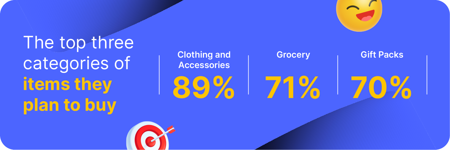 Data di atas menunjukkan bahwa 89% konsumen membeli pakaian, 71% konsumen membeli grocery seperti bahan makanan dan minuman untuk sahur dan berbuka. Selain itu, 70% konsumen membeli gift pack atau hampers yang biasa diberikan sebagai bingkisan lebaran untuk keluarga dan kerabat terdekat.