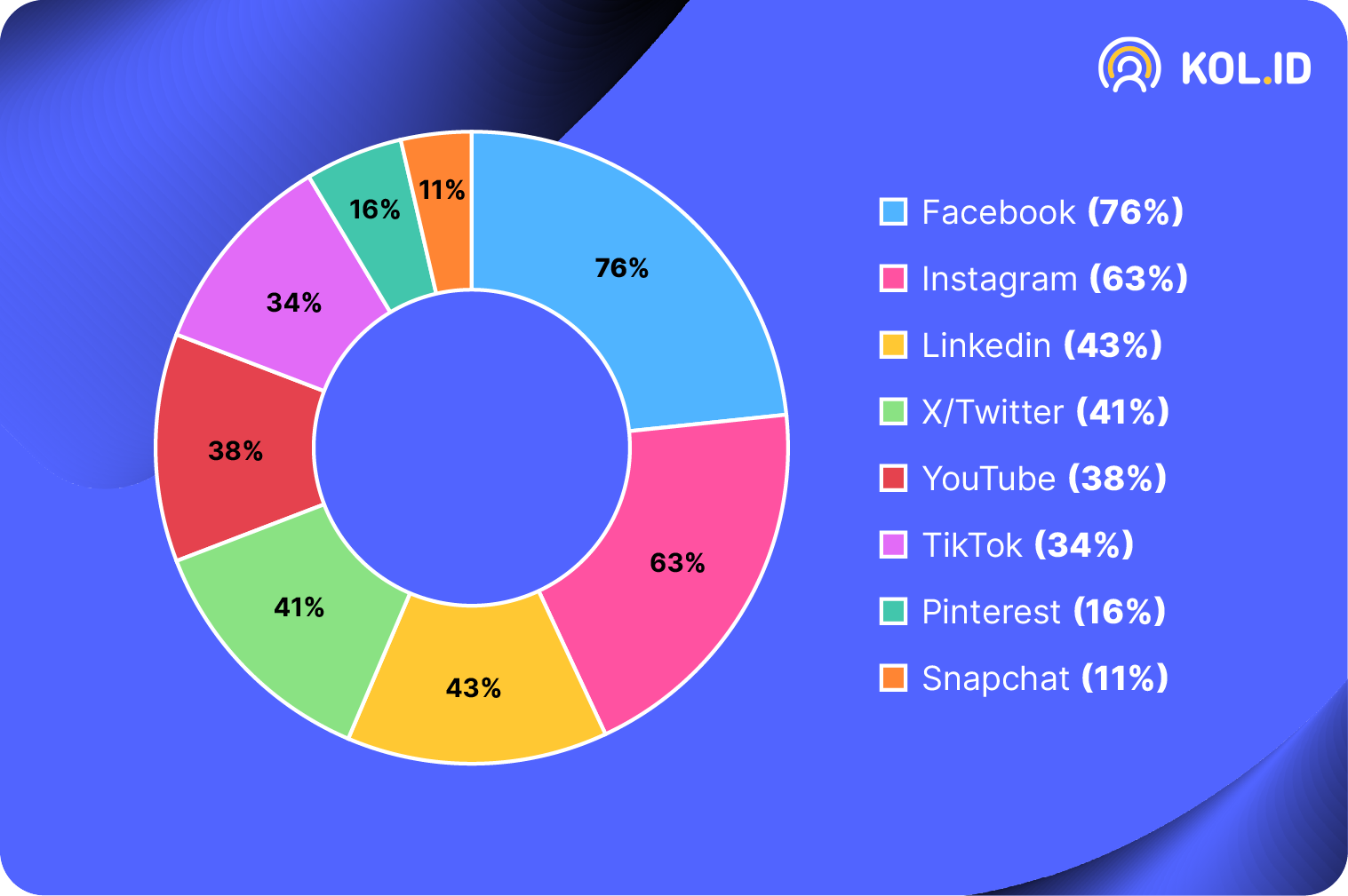 Data tersebut menunjukkan bahwa facebook menjadi social media yang paling populer di kalangan marketer. Sekitar 76% responden melaporkan bahwa Facebook digunakan untuk keperluan pemasaran. Peringkat kedua terdapat instagram sekitar 63% dan Linkedin 43%.