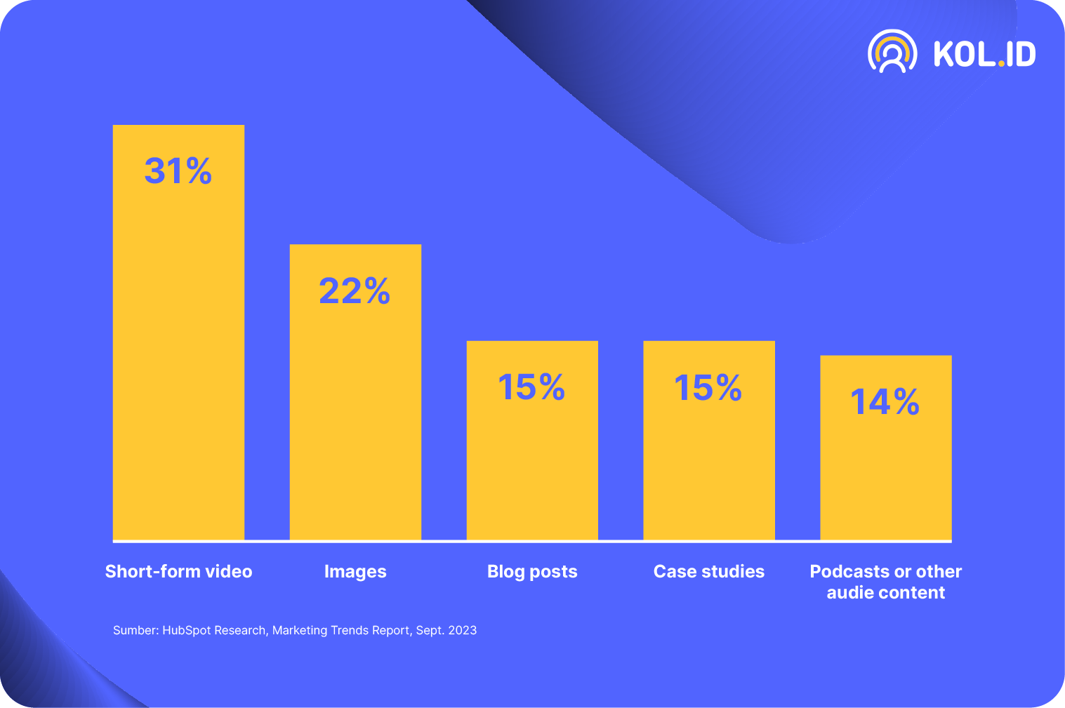 Dalam trend digital marketing industry, short-form video atau video berdurasi pendek menjadi format pemasaran konten peringkat 1. Hal ini dapat dilihat dari data Blog.hubspot.com yang menjelaskan bahwa short-form video menawarkan ROI tertinggi sekitar 31% dibandingkan konten lainnya.