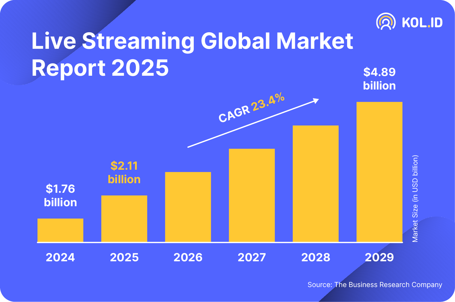 Melihat data global dari The Business Research Company, di tahun 2024 keuntungan yang dihasilkan dari live streaming berada di angka 1,76 miliar USD. Berkaca dari angka tersebut tren live streaming di tahun 2025 diperkirakan akan terus meningkat dan berada di angka 2,11 miliar USD dengan CAGR atau tingkat pertumbuhan majemuk sebesar 19,7%.